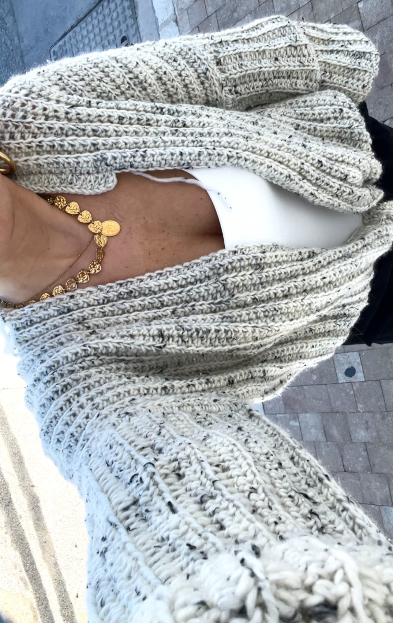 Gauge is achieved through a loose, chunky stitch technique. Swatching is recommended to ensure the cardigan achieves the intended fluffy, oversized look.